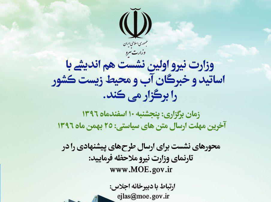 وزارت نیرو در نظر دارد با هدف پیریزی زمینههای تعامل مؤثر و مستمر وزارت نیرو و مدیریت بخش آب کشور با متخصصان این حوزه، اولین اجلاس «هماندیشی با متخصصان علوم آب و محیطزیست» را برگزار نماید.