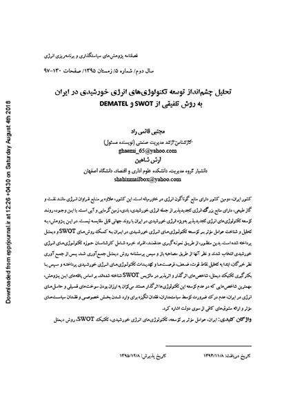 تحلیل چشم‌انداز توسعه تکنولوژی‌های انرژی خورشیدی در ایران به روش تلفیقی از SWOT و DEMATEL