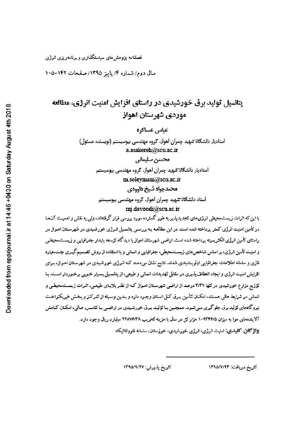 پتانسیل تولید برق خورشیدی در راستای افزایش امنیت انرژی، مطالعه موردی شهرستان اهواز