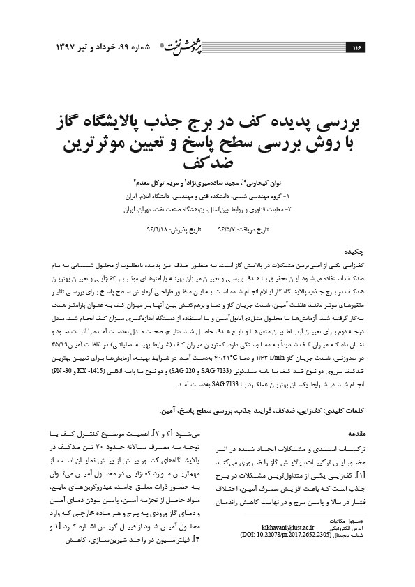 بررسی پدیده کف در برج جذب پالایشگاه گاز با روش بررسی سطح پاسخ و تعیین موثرترین ضدکف