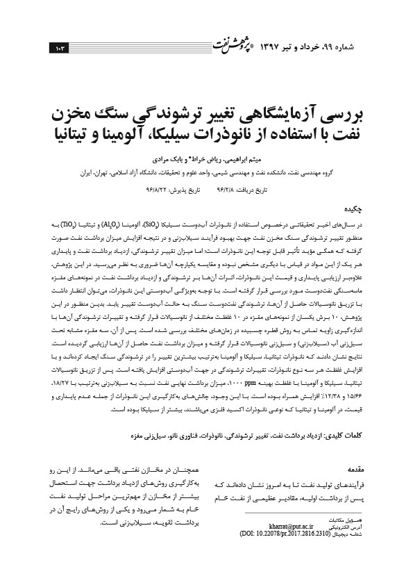 بررسی آزمایشگاهی تغییر ترشوندگی سنگ مخزن نفت با استفاده از نانوذرات سیلیکا، آلومینا و تیتانیا
