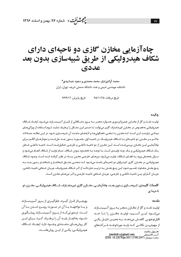 لزوم استفاده از ویژگیهای میدانی نیازمند این است که مخزن با تمامی ناهمگونیها و لایههای متعدد آن شبیهسازی شود. در این مقاله، معادلات حاکم بر مخزن دو ناحیهای با شکاف هیدرولیک در ناحیه اول، بهصورت بدون بعد حلشده و نمودارهای الگو برای چاهآزمایی این مخازن بررسیشده است.