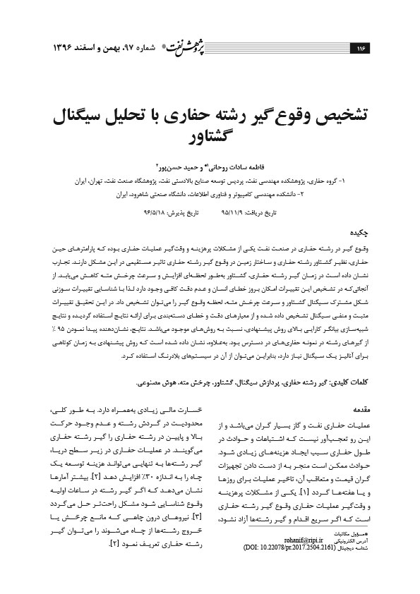 از آنجائیکه در تشخیص این تغییرات امکان بروز خطای انسان و عدم دقت کافی وجود دارد لذا با شناسایی تغییرات سوزنی شکل مشترک سیگنال گشتاور و سرعت چرخش مته، لحظه وقوع گیر را میتوان تشخیص داد.