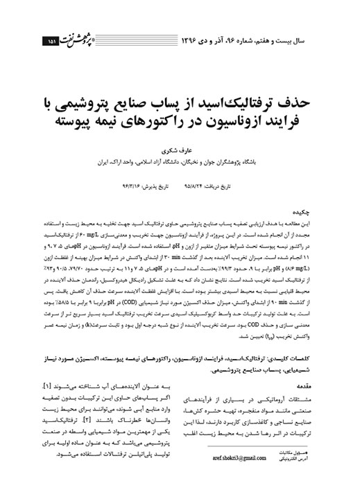 حذف ترفتالیک اسید از پساب صنایع پتروشیمی با فرایند ازوناسیون در راکتورهای نیمه پیوسته
